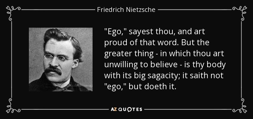 "Ego," sayest thou, and art proud of that word. But the greater thing - in which thou art unwilling to believe - is thy body with its big sagacity; it saith not "ego," but doeth it.