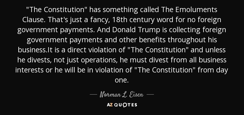 "The Constitution" has something called The Emoluments Clause. That's just a fancy, 18th century word for no foreign government payments. And Donald Trump is collecting foreign government payments and other benefits throughout his business.It is a direct violation of "The Constitution" and unless he divests, not just operations, he must divest from all business interests or he will be in violation of "The Constitution" from day one.