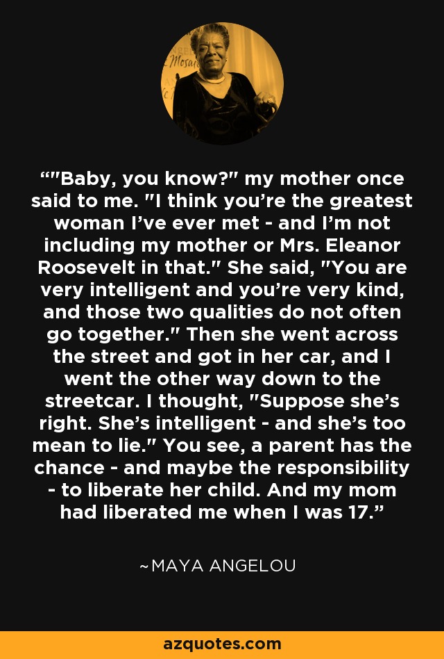 "Baby, you know?" my mother once said to me. "I think you're the greatest woman I've ever met - and I'm not including my mother or Mrs. Eleanor Roosevelt in that." She said, "You are very intelligent and you're very kind, and those two qualities do not often go together." Then she went across the street and got in her car, and I went the other way down to the streetcar. I thought, "Suppose she's right. She's intelligent - and she's too mean to lie." You see, a parent has the chance - and maybe the responsibility - to liberate her child. And my mom had liberated me when I was 17.