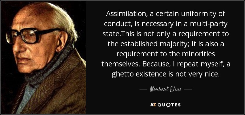 Assimilation, a certain uniformity of conduct, is necessary in a multi-party state.This is not only a requirement to the established majority; it is also a requirement to the minorities themselves. Because, I repeat myself, a ghetto existence is not very nice.