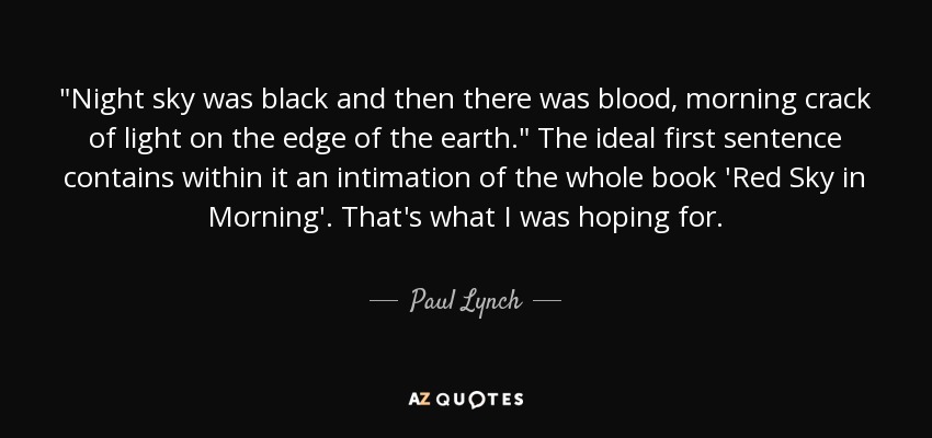 "Night sky was black and then there was blood, morning crack of light on the edge of the earth." The ideal first sentence contains within it an intimation of the whole book 'Red Sky in Morning'. That's what I was hoping for.