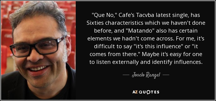 "Que No," Cafe's Tacvba latest single, has Sixties characteristics which we haven't done before, and "Matando" also has certain elements we hadn't come across. For me, it's difficult to say "it's this influence" or "it comes from there." Maybe it's easy for one to listen externally and identify influences.