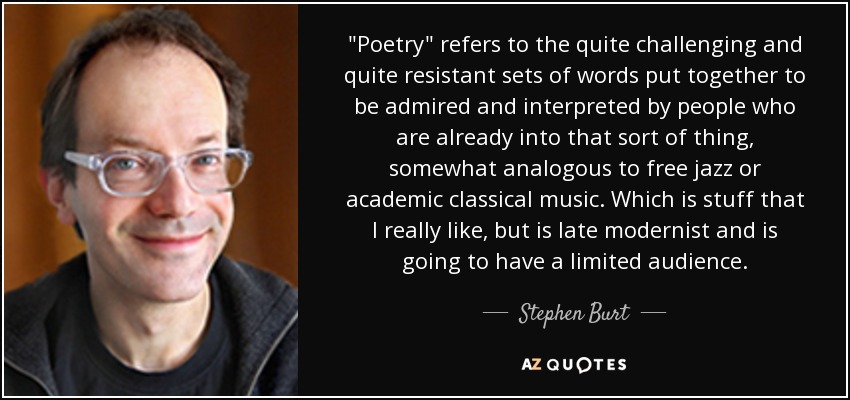 "Poetry" refers to the quite challenging and quite resistant sets of words put together to be admired and interpreted by people who are already into that sort of thing, somewhat analogous to free jazz or academic classical music. Which is stuff that I really like, but is late modernist and is going to have a limited audience.