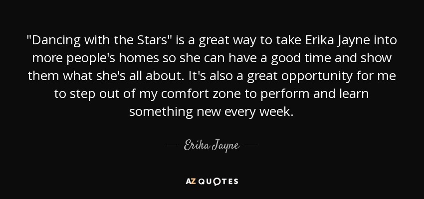 "Dancing with the Stars" is a great way to take Erika Jayne into more people's homes so she can have a good time and show them what she's all about. It's also a great opportunity for me to step out of my comfort zone to perform and learn something new every week.
