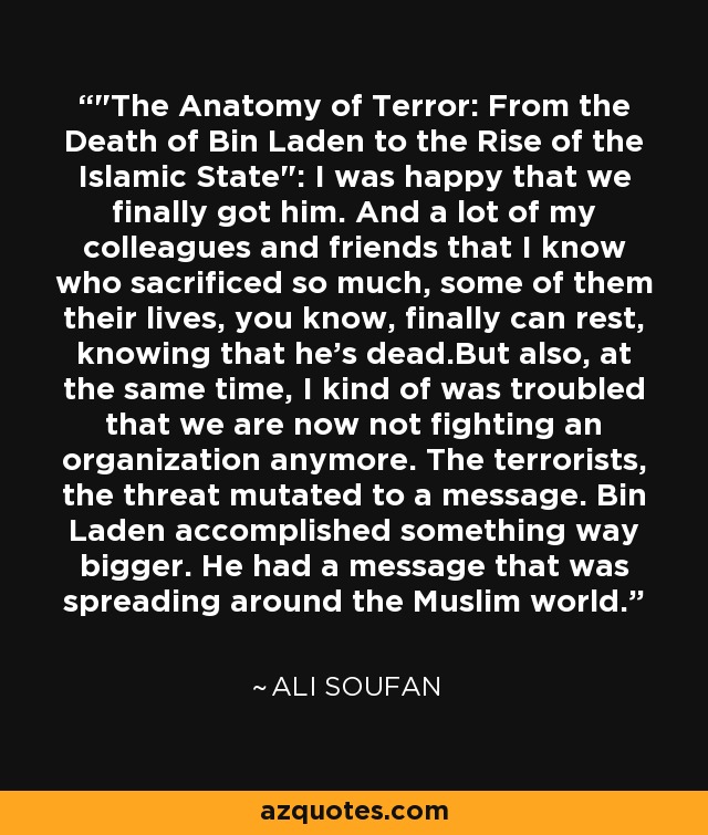 "The Anatomy of Terror: From the Death of Bin Laden to the Rise of the Islamic State": I was happy that we finally got him. And a lot of my colleagues and friends that I know who sacrificed so much, some of them their lives, you know, finally can rest, knowing that he's dead.But also, at the same time, I kind of was troubled that we are now not fighting an organization anymore. The terrorists, the threat mutated to a message. Bin Laden accomplished something way bigger. He had a message that was spreading around the Muslim world.
