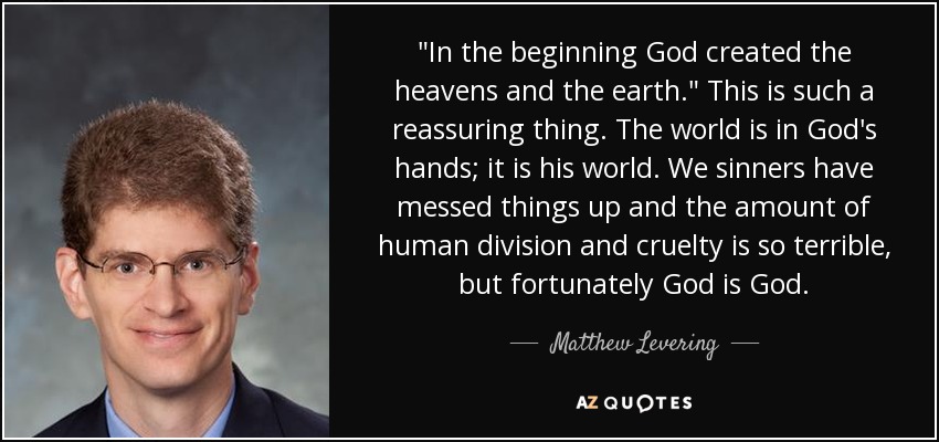 "In the beginning God created the heavens and the earth." This is such a reassuring thing. The world is in God's hands; it is his world. We sinners have messed things up and the amount of human division and cruelty is so terrible, but fortunately God is God.