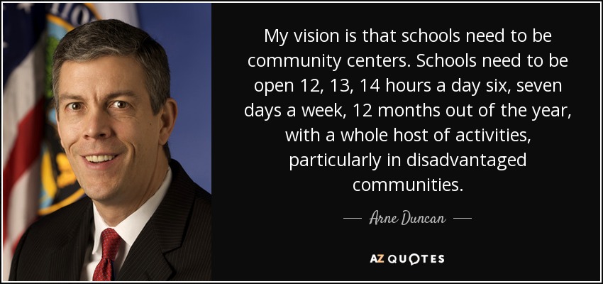 My vision is that schools need to be community centers. Schools need to be open 12, 13, 14 hours a day six, seven days a week, 12 months out of the year, with a whole host of activities, particularly in disadvantaged communities.