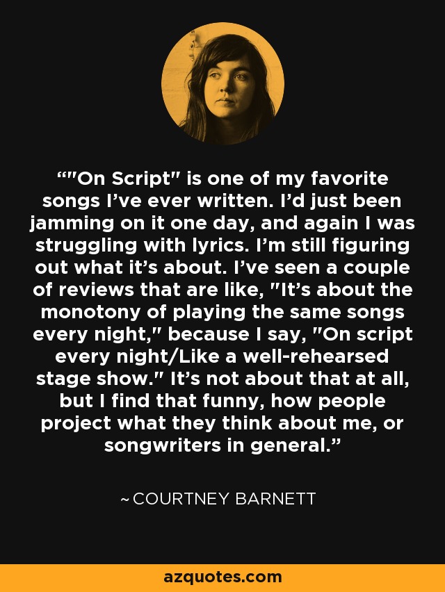 "On Script" is one of my favorite songs I've ever written. I'd just been jamming on it one day, and again I was struggling with lyrics. I'm still figuring out what it's about. I've seen a couple of reviews that are like, "It's about the monotony of playing the same songs every night," because I say, "On script every night/Like a well-rehearsed stage show." It's not about that at all, but I find that funny, how people project what they think about me, or songwriters in general.