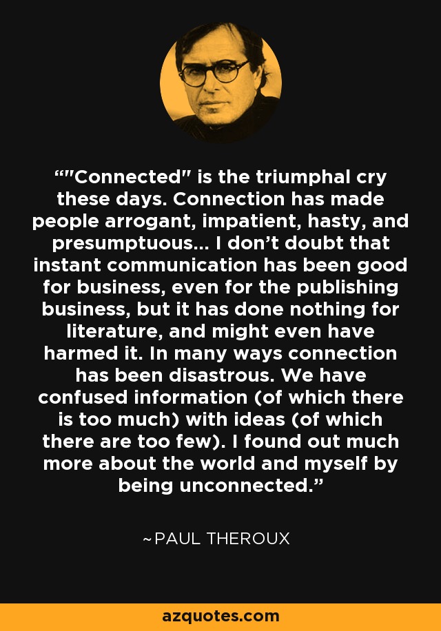 "Connected" is the triumphal cry these days. Connection has made people arrogant, impatient, hasty, and presumptuous... I don't doubt that instant communication has been good for business, even for the publishing business, but it has done nothing for literature, and might even have harmed it. In many ways connection has been disastrous. We have confused information (of which there is too much) with ideas (of which there are too few). I found out much more about the world and myself by being unconnected.
