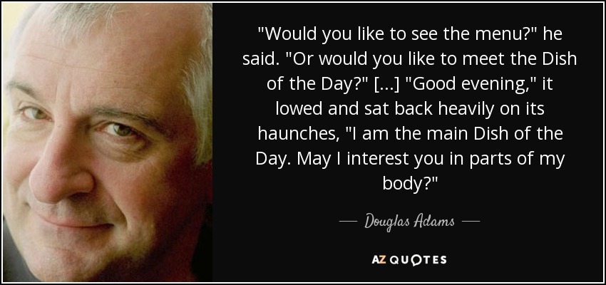 "Would you like to see the menu?" he said. "Or would you like to meet the Dish of the Day?" [...] "Good evening," it lowed and sat back heavily on its haunches, "I am the main Dish of the Day. May I interest you in parts of my body?"