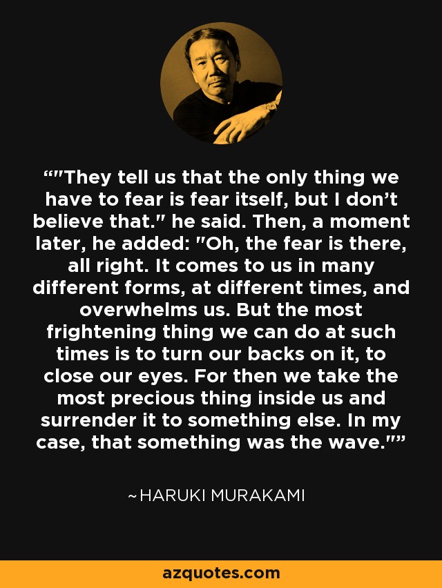 "They tell us that the only thing we have to fear is fear itself, but I don't believe that." he said. Then, a moment later, he added: "Oh, the fear is there, all right. It comes to us in many different forms, at different times, and overwhelms us. But the most frightening thing we can do at such times is to turn our backs on it, to close our eyes. For then we take the most precious thing inside us and surrender it to something else. In my case, that something was the wave."