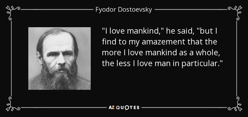 "I love mankind," he said, "but I find to my amazement that the more I love mankind as a whole, the less I love man in particular."