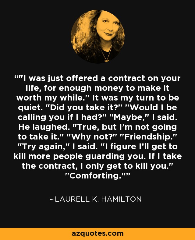 "I was just offered a contract on your life, for enough money to make it worth my while." It was my turn to be quiet. "Did you take it?" "Would I be calling you if I had?" "Maybe," I said. He laughed. "True, but I'm not going to take it." "Why not?" "Friendship." "Try again," I said. "I figure I'll get to kill more people guarding you. If I take the contract, I only get to kill you." "Comforting."