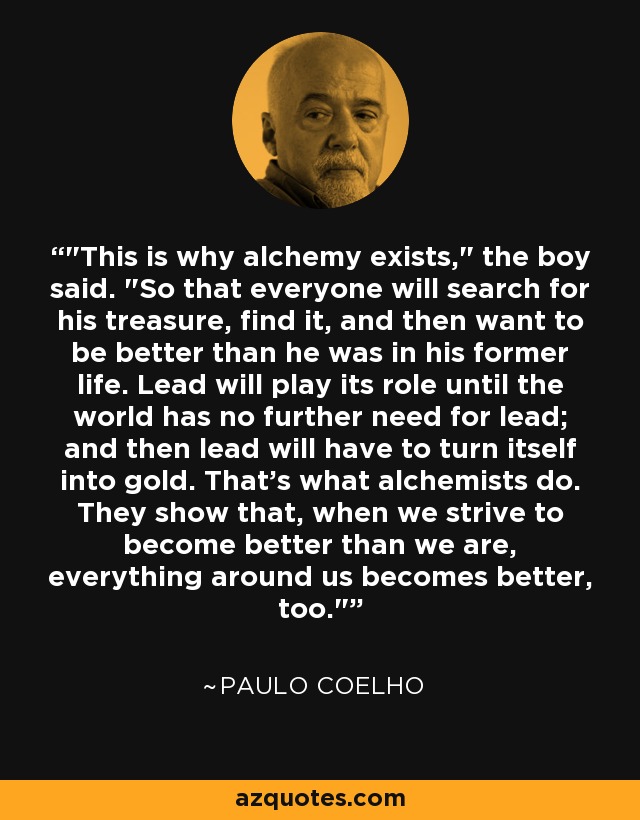 "This is why alchemy exists," the boy said. "So that everyone will search for his treasure, find it, and then want to be better than he was in his former life. Lead will play its role until the world has no further need for lead; and then lead will have to turn itself into gold. That's what alchemists do. They show that, when we strive to become better than we are, everything around us becomes better, too."