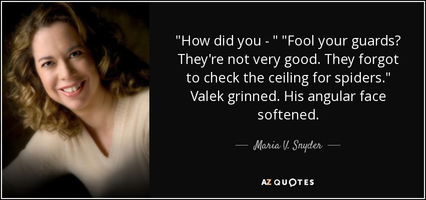 "How did you - " "Fool your guards? They're not very good. They forgot to check the ceiling for spiders." Valek grinned. His angular face softened.