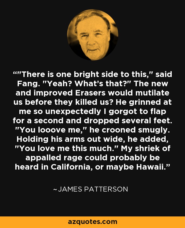"There is one bright side to this," said Fang. "Yeah? What's that?" The new and improved Erasers would mutilate us before they killed us? He grinned at me so unexpectedly I gorgot to flap for a second and dropped several feet. "You looove me," he crooned smugly. Holding his arms out wide, he added, "You love me this much." My shriek of appalled rage could probably be heard in California, or maybe Hawaii.