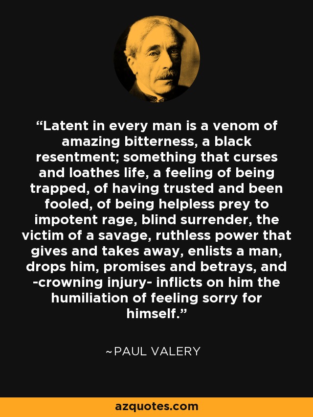 Latent in every man is a venom of amazing bitterness, a black resentment; something that curses and loathes life, a feeling of being trapped, of having trusted and been fooled, of being helpless prey to impotent rage, blind surrender, the victim of a savage, ruthless power that gives and takes away, enlists a man, drops him, promises and betrays, and -crowning injury- inflicts on him the humiliation of feeling sorry for himself.