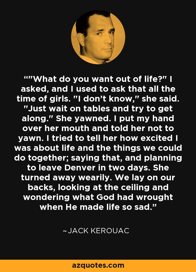 "What do you want out of life?" I asked, and I used to ask that all the time of girls. "I don't know," she said. "Just wait on tables and try to get along." She yawned. I put my hand over her mouth and told her not to yawn. I tried to tell her how excited I was about life and the things we could do together; saying that, and planning to leave Denver in two days. She turned away wearily. We lay on our backs, looking at the ceiling and wondering what God had wrought when He made life so sad.