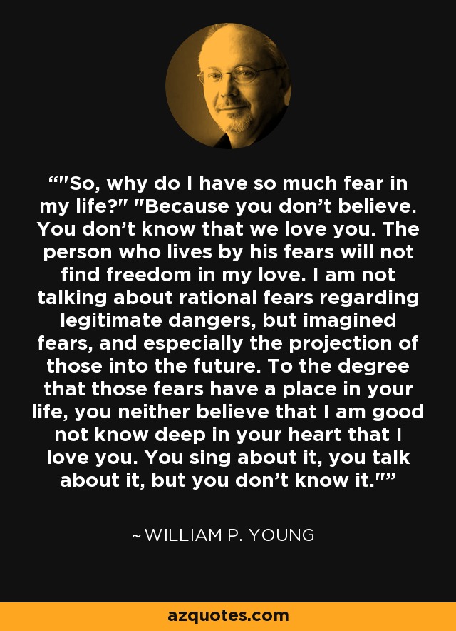 "So, why do I have so much fear in my life?" "Because you don't believe. You don't know that we love you. The person who lives by his fears will not find freedom in my love. I am not talking about rational fears regarding legitimate dangers, but imagined fears, and especially the projection of those into the future. To the degree that those fears have a place in your life, you neither believe that I am good not know deep in your heart that I love you. You sing about it, you talk about it, but you don't know it."