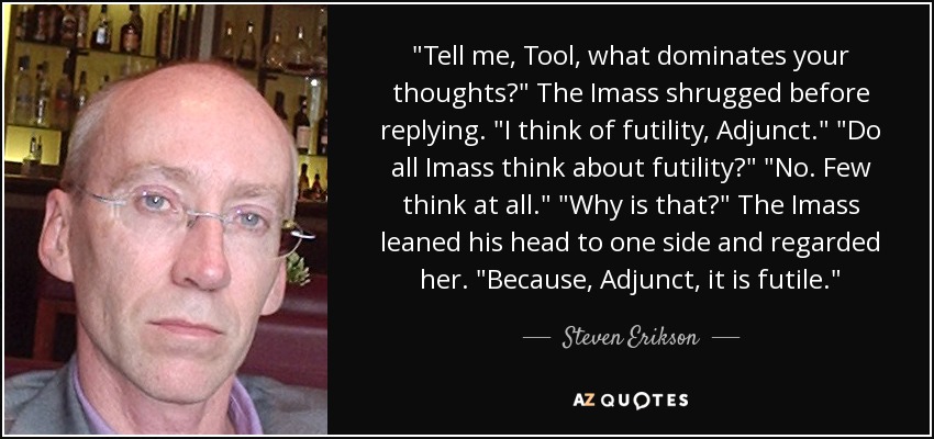 "Tell me, Tool, what dominates your thoughts?" The Imass shrugged before replying. "I think of futility, Adjunct." "Do all Imass think about futility?" "No. Few think at all." "Why is that?" The Imass leaned his head to one side and regarded her. "Because, Adjunct, it is futile."