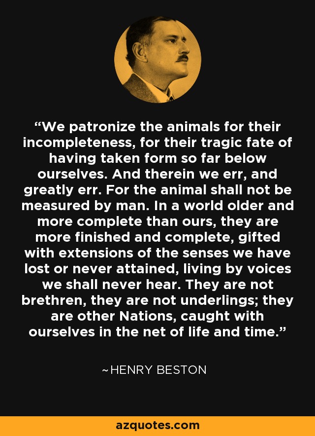 We patronize the animals for their incompleteness, for their tragic fate of having taken form so far below ourselves. And therein we err, and greatly err. For the animal shall not be measured by man. In a world older and more complete than ours, they are more finished and complete, gifted with extensions of the senses we have lost or never attained, living by voices we shall never hear. They are not brethren, they are not underlings; they are other Nations, caught with ourselves in the net of life and time.