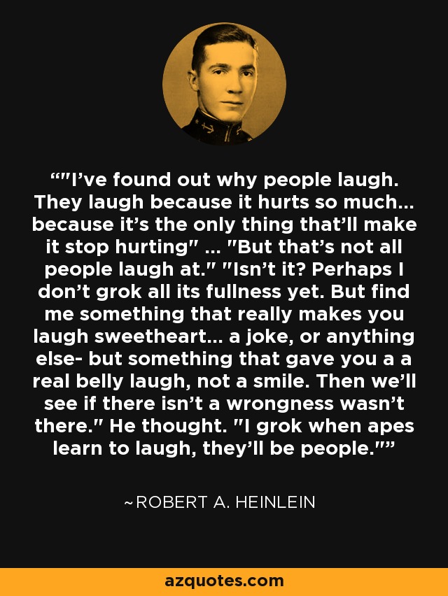 "I've found out why people laugh. They laugh because it hurts so much... because it's the only thing that'll make it stop hurting" ... "But that's not all people laugh at." "Isn't it? Perhaps I don't grok all its fullness yet. But find me something that really makes you laugh sweetheart... a joke, or anything else- but something that gave you a a real belly laugh, not a smile. Then we'll see if there isn't a wrongness wasn't there." He thought. "I grok when apes learn to laugh, they'll be people."