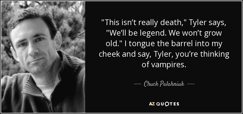 "This isn’t really death," Tyler says, "We’ll be legend. We won’t grow old." I tongue the barrel into my cheek and say, Tyler, you’re thinking of vampires.