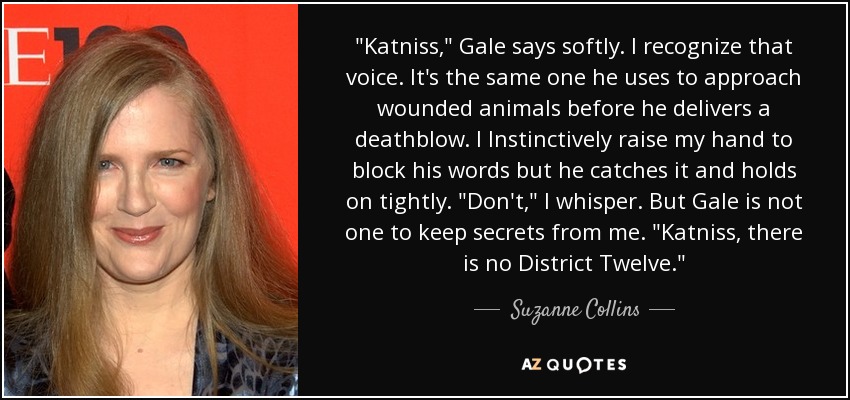 "Katniss," Gale says softly. I recognize that voice. It's the same one he uses to approach wounded animals before he delivers a deathblow. I Instinctively raise my hand to block his words but he catches it and holds on tightly. "Don't," I whisper. But Gale is not one to keep secrets from me. "Katniss, there is no District Twelve."