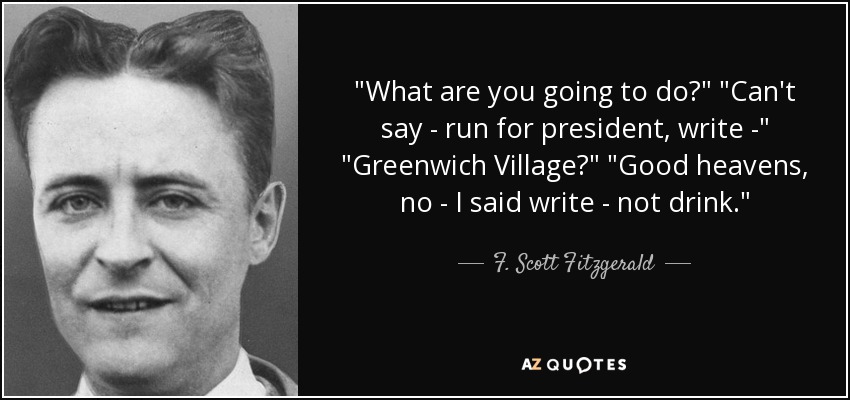 "What are you going to do?" "Can't say - run for president, write -" "Greenwich Village?" "Good heavens, no - I said write - not drink."
