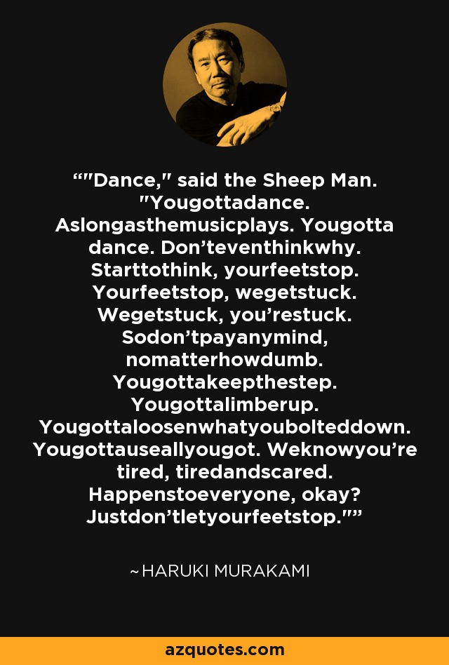 "Dance," said the Sheep Man. "Yougottadance. Aslongasthemusicplays. Yougotta dance. Don'teventhinkwhy. Starttothink, yourfeetstop. Yourfeetstop, wegetstuck. Wegetstuck, you'restuck. Sodon'tpayanymind, nomatterhowdumb. Yougottakeepthestep. Yougottalimberup. Yougottaloosenwhatyoubolteddown. Yougottauseallyougot. Weknowyou're tired, tiredandscared. Happenstoeveryone, okay? Justdon'tletyourfeetstop."