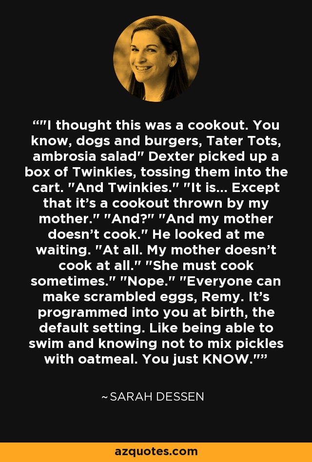 "I thought this was a cookout. You know, dogs and burgers, Tater Tots, ambrosia salad" Dexter picked up a box of Twinkies, tossing them into the cart. "And Twinkies." "It is... Except that it's a cookout thrown by my mother." "And?" "And my mother doesn't cook." He looked at me waiting. "At all. My mother doesn't cook at all." "She must cook sometimes." "Nope." "Everyone can make scrambled eggs, Remy. It's programmed into you at birth, the default setting. Like being able to swim and knowing not to mix pickles with oatmeal. You just KNOW."