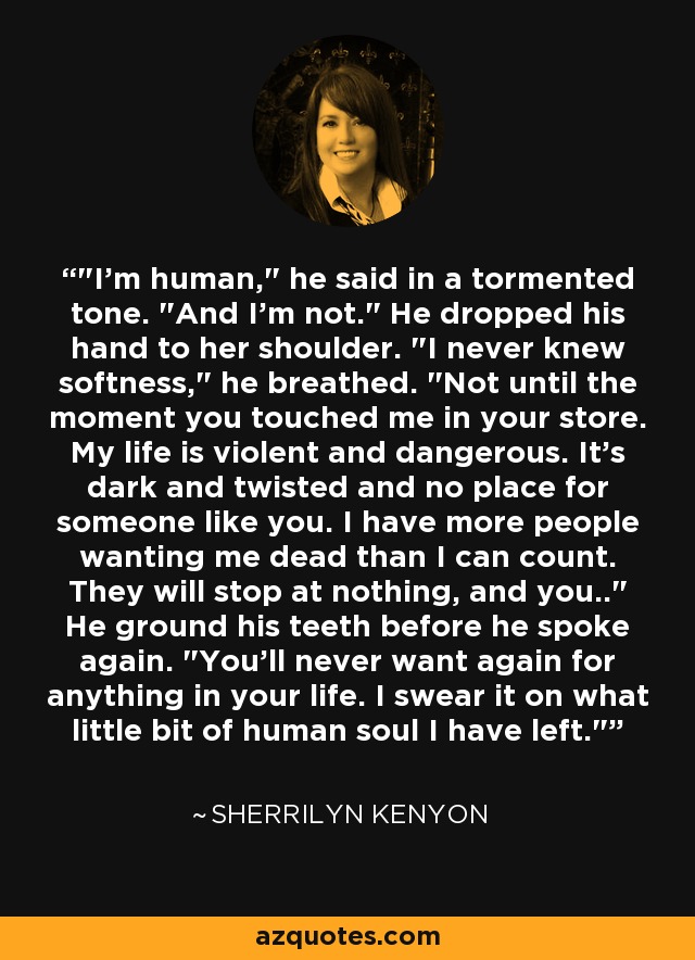 "I'm human," he said in a tormented tone. "And I'm not." He dropped his hand to her shoulder. "I never knew softness," he breathed. "Not until the moment you touched me in your store. My life is violent and dangerous. It's dark and twisted and no place for someone like you. I have more people wanting me dead than I can count. They will stop at nothing, and you.." He ground his teeth before he spoke again. "You'll never want again for anything in your life. I swear it on what little bit of human soul I have left."