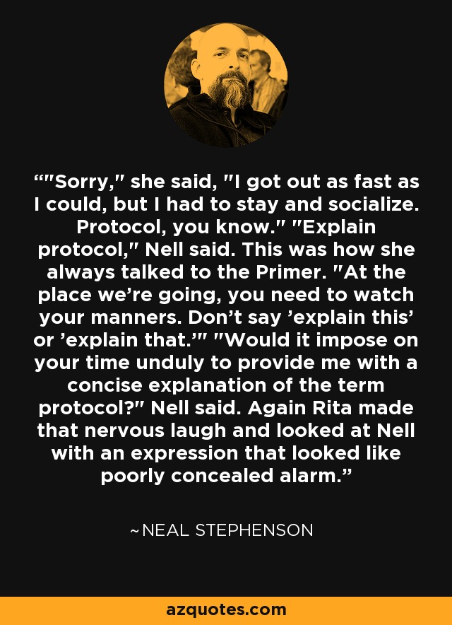 "Sorry," she said, "I got out as fast as I could, but I had to stay and socialize. Protocol, you know." "Explain protocol," Nell said. This was how she always talked to the Primer. "At the place we’re going, you need to watch your manners. Don’t say 'explain this' or 'explain that.'" "Would it impose on your time unduly to provide me with a concise explanation of the term protocol?" Nell said. Again Rita made that nervous laugh and looked at Nell with an expression that looked like poorly concealed alarm.