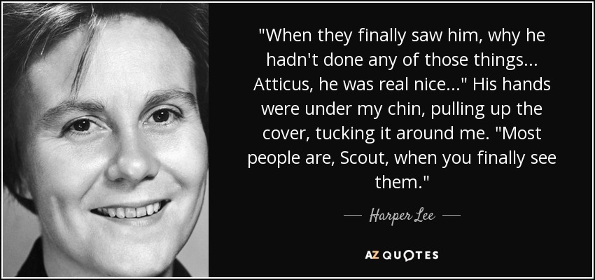 "When they finally saw him, why he hadn't done any of those things... Atticus, he was real nice..." His hands were under my chin, pulling up the cover, tucking it around me. "Most people are, Scout, when you finally see them."