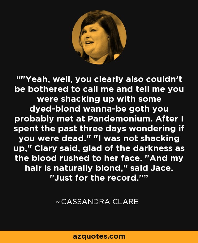 "Yeah, well, you clearly also couldn't be bothered to call me and tell me you were shacking up with some dyed-blond wanna-be goth you probably met at Pandemonium. After I spent the past three days wondering if you were dead." "I was not shacking up," Clary said, glad of the darkness as the blood rushed to her face. "And my hair is naturally blond," said Jace. "Just for the record."