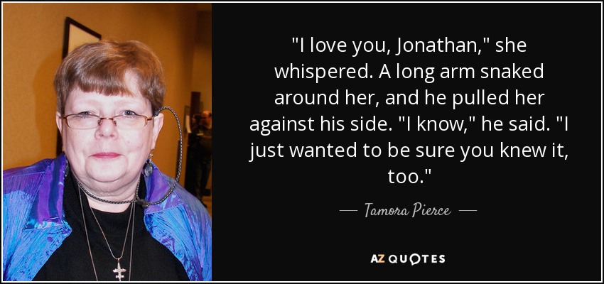 "I love you, Jonathan," she whispered. A long arm snaked around her, and he pulled her against his side. "I know," he said. "I just wanted to be sure you knew it, too."