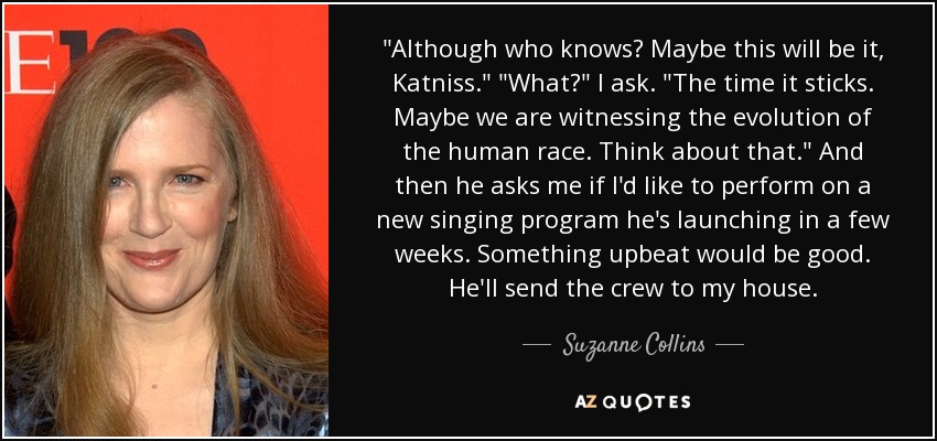 "Although who knows? Maybe this will be it, Katniss." "What?" I ask. "The time it sticks. Maybe we are witnessing the evolution of the human race. Think about that." And then he asks me if I'd like to perform on a new singing program he's launching in a few weeks. Something upbeat would be good. He'll send the crew to my house.