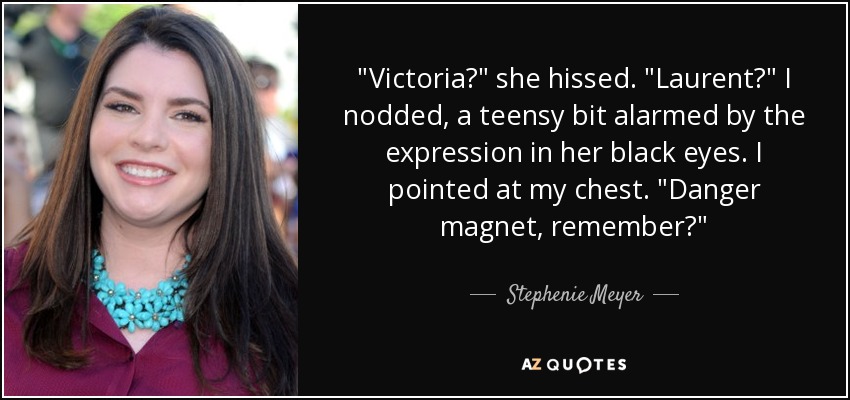 "Victoria?" she hissed. "Laurent?" I nodded, a teensy bit alarmed by the expression in her black eyes. I pointed at my chest. "Danger magnet, remember?"