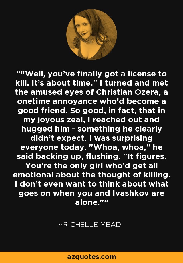 "Well, you've finally got a license to kill. It's about time." I turned and met the amused eyes of Christian Ozera, a onetime annoyance who'd become a good friend. So good, in fact, that in my joyous zeal, I reached out and hugged him - something he clearly didn't expect. I was surprising everyone today. "Whoa, whoa," he said backing up, flushing. "It figures. You're the only girl who'd get all emotional about the thought of killing. I don't even want to think about what goes on when you and Ivashkov are alone."