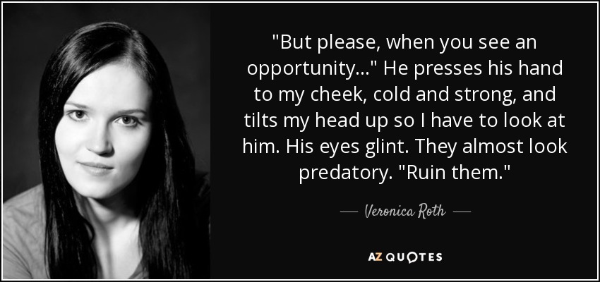 "But please, when you see an opportunity..." He presses his hand to my cheek, cold and strong, and tilts my head up so I have to look at him. His eyes glint. They almost look predatory. "Ruin them."