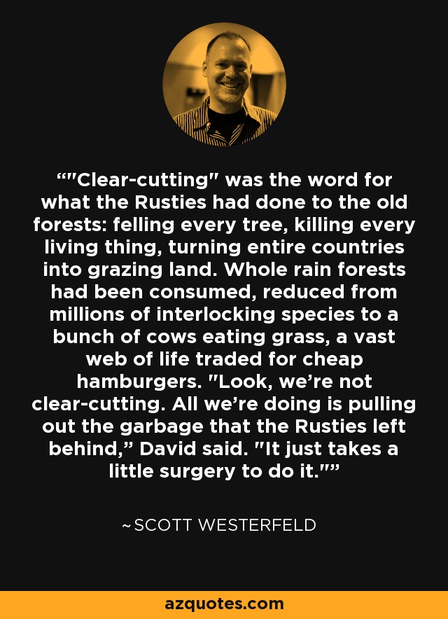 "Clear-cutting" was the word for what the Rusties had done to the old forests: felling every tree, killing every living thing, turning entire countries into grazing land. Whole rain forests had been consumed, reduced from millions of interlocking species to a bunch of cows eating grass, a vast web of life traded for cheap hamburgers. "Look, we're not clear-cutting. All we're doing is pulling out the garbage that the Rusties left behind,” David said. "It just takes a little surgery to do it."