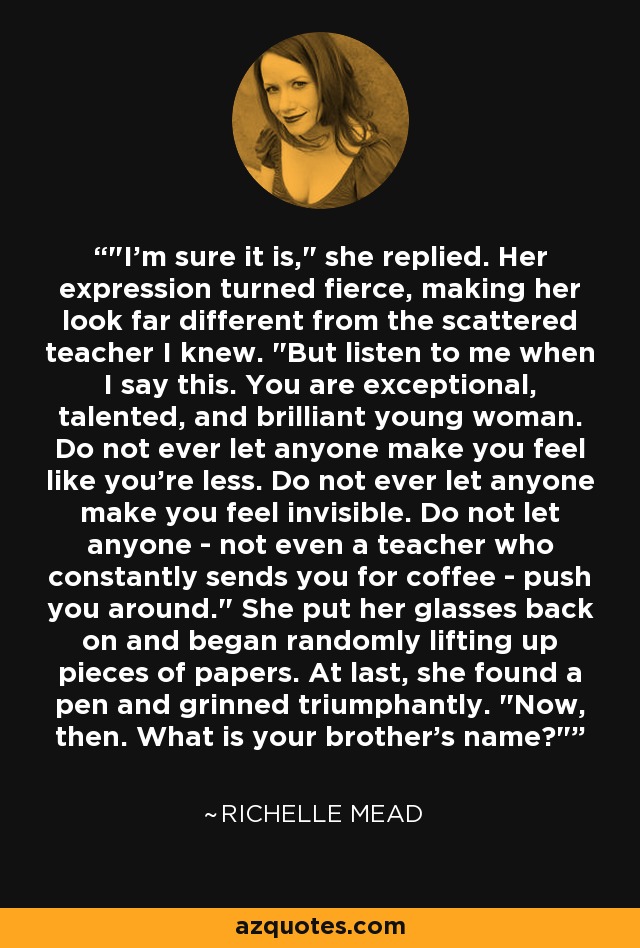 "I'm sure it is," she replied. Her expression turned fierce, making her look far different from the scattered teacher I knew. "But listen to me when I say this. You are exceptional, talented, and brilliant young woman. Do not ever let anyone make you feel like you're less. Do not ever let anyone make you feel invisible. Do not let anyone - not even a teacher who constantly sends you for coffee - push you around." She put her glasses back on and began randomly lifting up pieces of papers. At last, she found a pen and grinned triumphantly. "Now, then. What is your brother's name?"