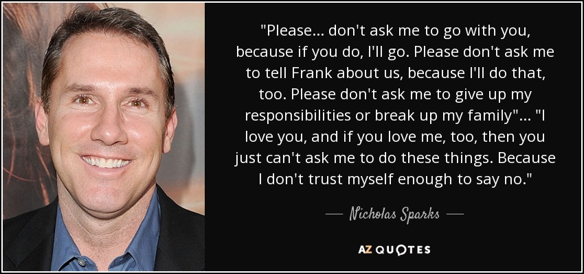 "Please... don't ask me to go with you, because if you do, I'll go. Please don't ask me to tell Frank about us, because I'll do that, too. Please don't ask me to give up my responsibilities or break up my family"... "I love you, and if you love me, too, then you just can't ask me to do these things. Because I don't trust myself enough to say no."