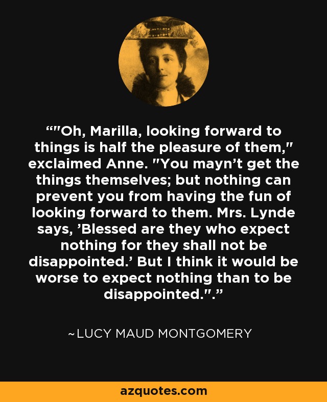 "Oh, Marilla, looking forward to things is half the pleasure of them," exclaimed Anne. "You mayn't get the things themselves; but nothing can prevent you from having the fun of looking forward to them. Mrs. Lynde says, 'Blessed are they who expect nothing for they shall not be disappointed.' But I think it would be worse to expect nothing than to be disappointed.".