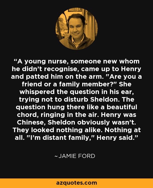 A young nurse, someone new whom he didn't recognise, came up to Henry and patted him on the arm. "Are you a friend or a family member?" She whispered the question in his ear, trying not to disturb Sheldon. The question hung there like a beautiful chord, ringing in the air. Henry was Chinese, Sheldon obviously wasn't. They looked nothing alike. Nothing at all. "I'm distant family," Henry said.