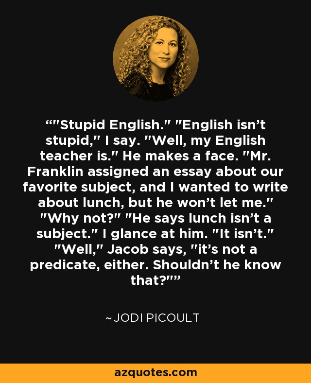 "Well, my English teacher is." He makes a face. "Mr. Franklin assigned an essay about our favorite subject, and I wanted to write about lunch, but he won't let me."