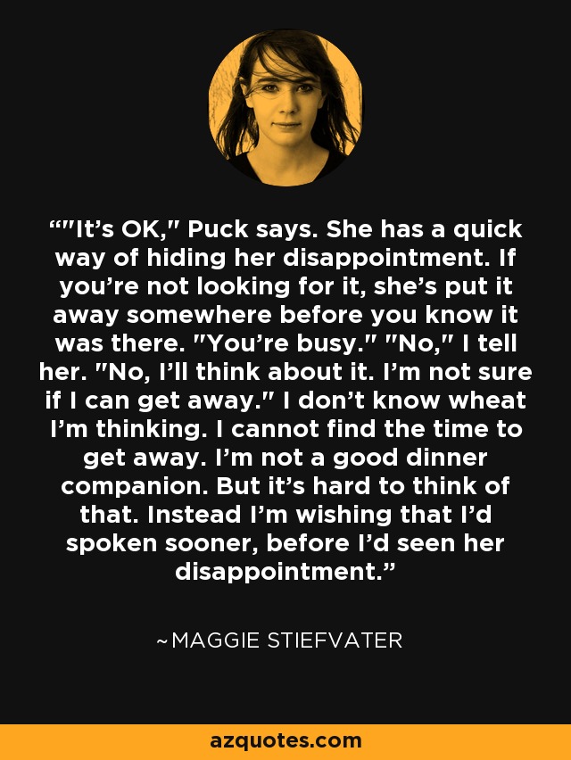 "It's OK," Puck says. She has a quick way of hiding her disappointment. If you're not looking for it, she's put it away somewhere before you know it was there. "You're busy." "No," I tell her. "No, I'll think about it. I'm not sure if I can get away." I don't know wheat I'm thinking. I cannot find the time to get away. I'm not a good dinner companion. But it's hard to think of that. Instead I'm wishing that I'd spoken sooner, before I'd seen her disappointment.