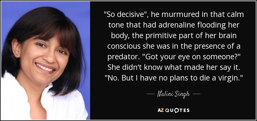 "So decisive", he murmured in that calm tone that had adrenaline flooding her body, the primitive part of her brain conscious she was in the presence of a predator. "Got your eye on someone?" She didn‘t know what made her say it. "No. But I have no plans to die a virgin."