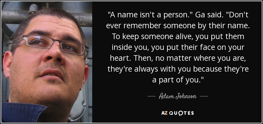 "A name isn't a person." Ga said. "Don't ever remember someone by their name. To keep someone alive, you put them inside you, you put their face on your heart. Then, no matter where you are, they're always with you because they're a part of you."
