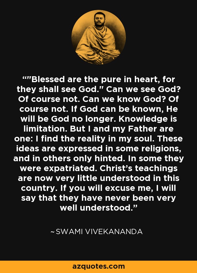 "Blessed are the pure in heart, for they shall see God." Can we see God? Of course not. Can we know God? Of course not. If God can be known, He will be God no longer. Knowledge is limitation. But I and my Father are one: I find the reality in my soul. These ideas are expressed in some religions, and in others only hinted. In some they were expatriated. Christ's teachings are now very little understood in this country. If you will excuse me, I will say that they have never been very well understood.